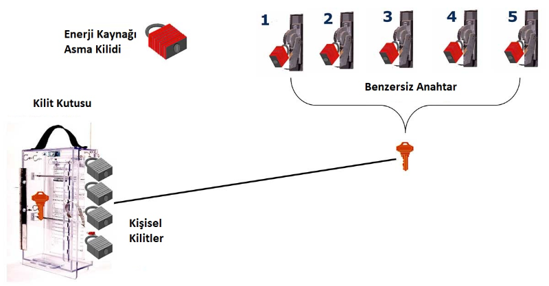 İki veya daha fazla yetkili çalışan, bir veya daha fazla enerji yalıtım cihazına sahip bir ekipman veya makine üzerinde çalışırken, aşağıda gösterilenler gibi çok kilitli bir çoklayıcı her bir enerji yalıtım cihazına bağlanır ve kapalı konumda sabitlenir. Daha sonra, her yetkili çalışan, kişisel kilidini kilit çoklayıcısına bağlar ve çalışmaları boyunca orada bırakır. Hiç kimse çoklayıcıyı kaldıramaz ve son işçi çoklayıcıdan kendi kişisel kilidini kaldırana kadar enerji izolasyon cihazına yeniden enerji vermek mümkün değildir.